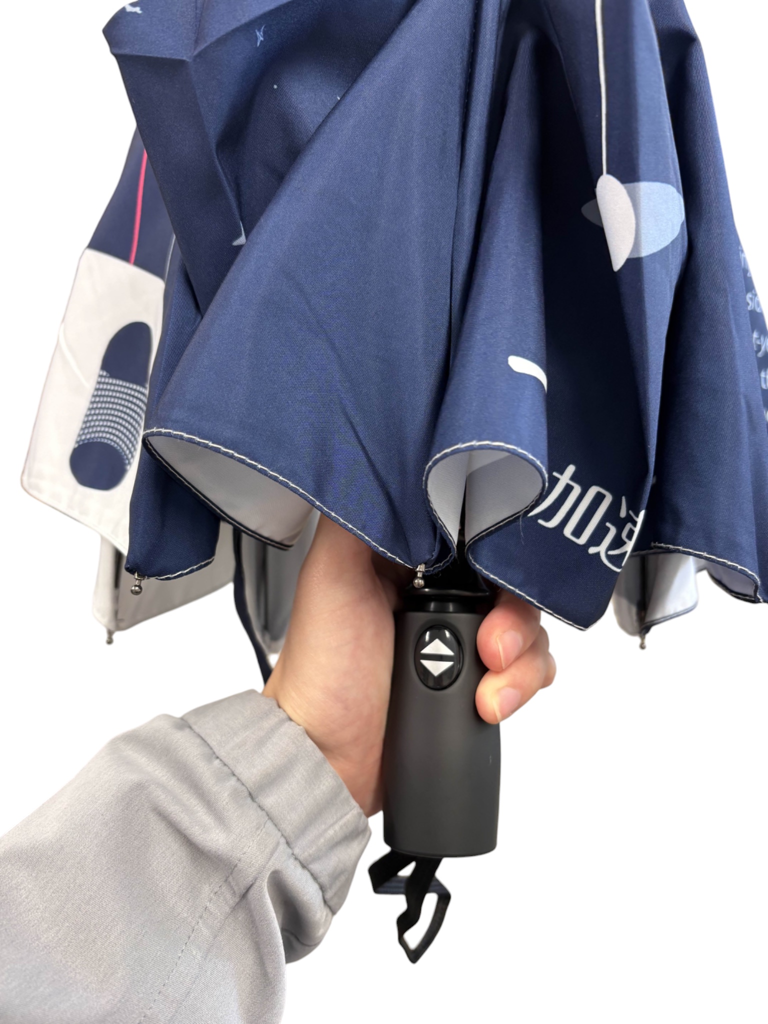 傘を広げると、青い夜空に描かれた“宇宙線の空気シャワー”が大きく展開し、